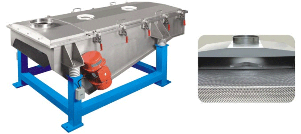 振動(dòng)篩由振動(dòng)馬達(dá)、篩網(wǎng)、本體支座及減震塊組成。在振動(dòng)馬達(dá)的作用下,物料沿直線向前運(yùn)動(dòng),在其輸送過(guò)程中,通過(guò)不同的網(wǎng)孔篩選,將超長(zhǎng)、并列以及粉末篩分出來(lái)。整體采用全封閉設(shè)計(jì),外設(shè)取樣觀察口,采用C型夾固定,可以快速拆卸清理或更換篩網(wǎng)。