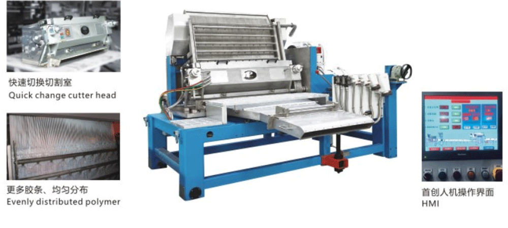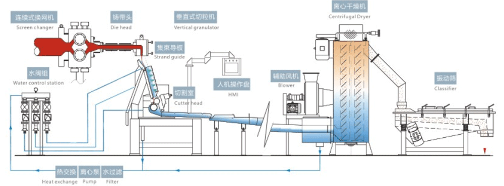 熔融物料經過鑄帶頭(模頭)分配,均勻形成多股膠條,在溢流水和噴淋水的冷卻下凝固結晶。物料籍由重力可以流入到切割室,在引料羅拉牽引下,通過旋轉的回轉切刀,在半凝固狀態下切成所需規格的切片。切片在輸送冷卻水的作用下通過后續冷卻段進入離心式干燥機,在離心風機的輔助下脫除切片表面水份。干燥后的切片進入振動篩進行篩分,分理出超長切片和細小粉末。